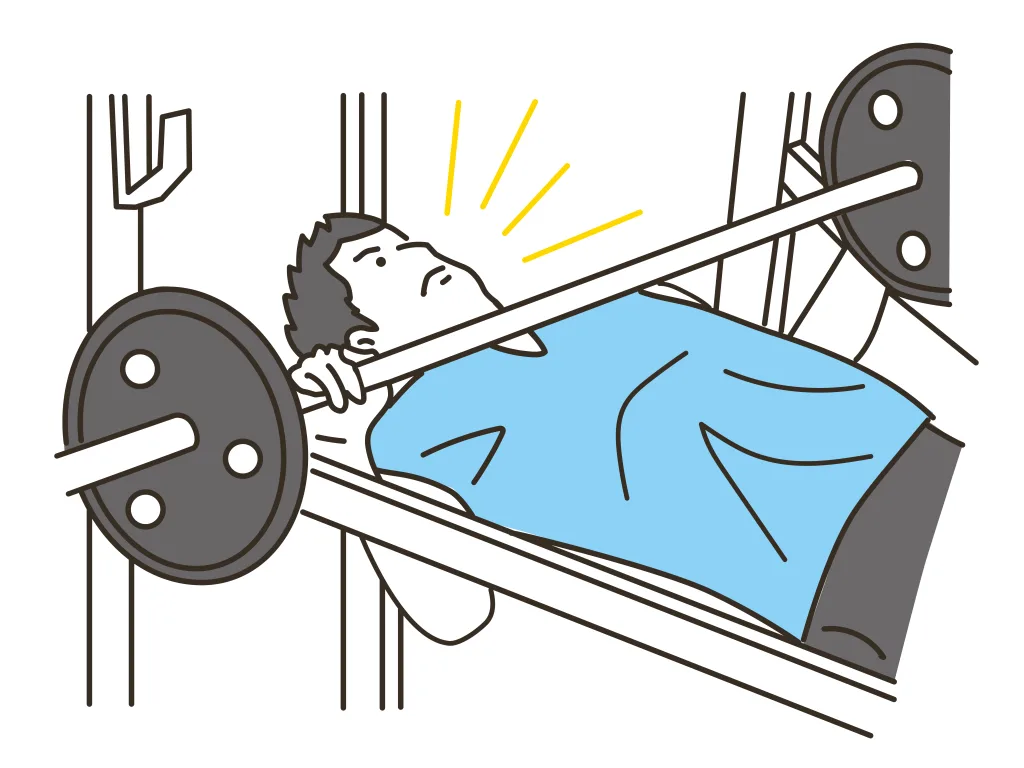 ベンチプレスは重量が伸びやすいため、つい「もっと重く!」と挑戦したくなりますが、フォームが崩れた状態で高重量を扱うとケガのリスクが高まります。