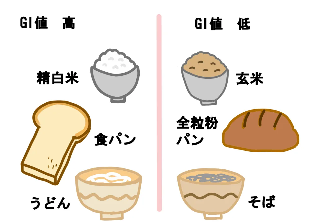 また、白米より玄米、食パンより全粒粉パン、砂糖より果物など、消化吸収のゆっくりな「低GI食品」を選ぶのも効果的です。